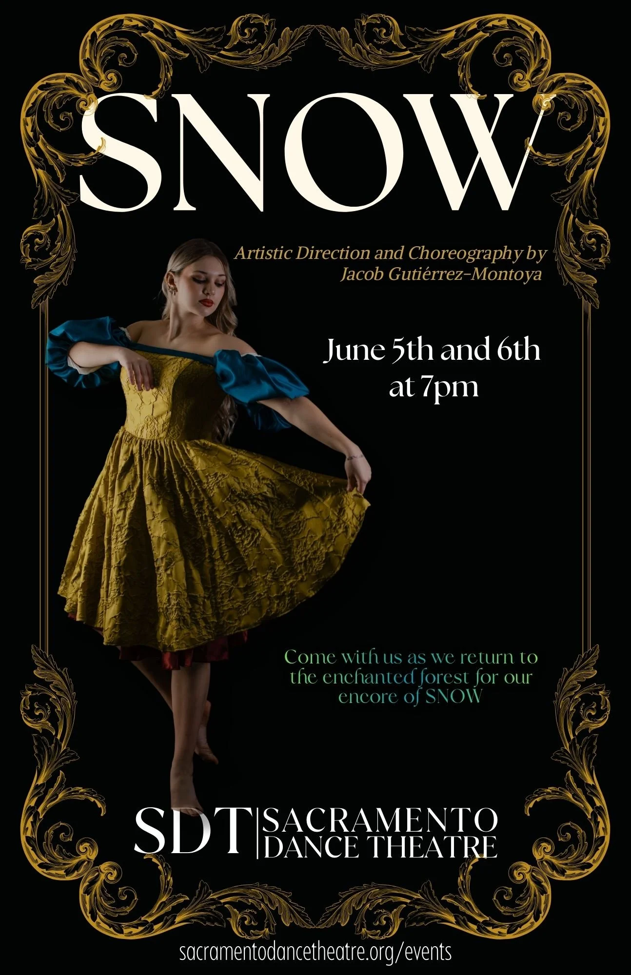 Sacramento Dance Theatre proudly presents an innovative dance interpretation of the timeless fairytale, Snow White, blending classic storytelling with contemporary movement to captivate audiences of all ages. This production transforms the familiar narrative into a visually stunning journey, where each dancer embodies the characters through expressive choreography, evoking the magic, mystery, and emotion of the story. Through a dynamic fusion of ballet, modern, and theatrical dance styles, the performance shines a new light on Snow White’s classic story.